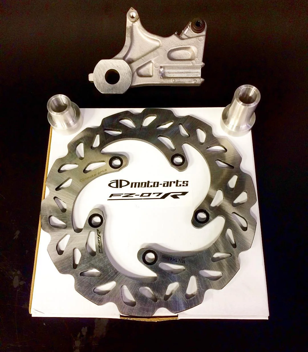 Includes our custom brake rotor and all necessary parts and machining to mount OEM Yamaha R6 rear wheels directly onto the FZ07. Caliper brackets are exchanged for your stock piece.